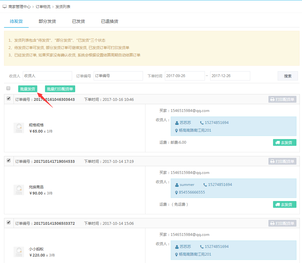 首先选中需要批量发货的订单,点击批量发货。