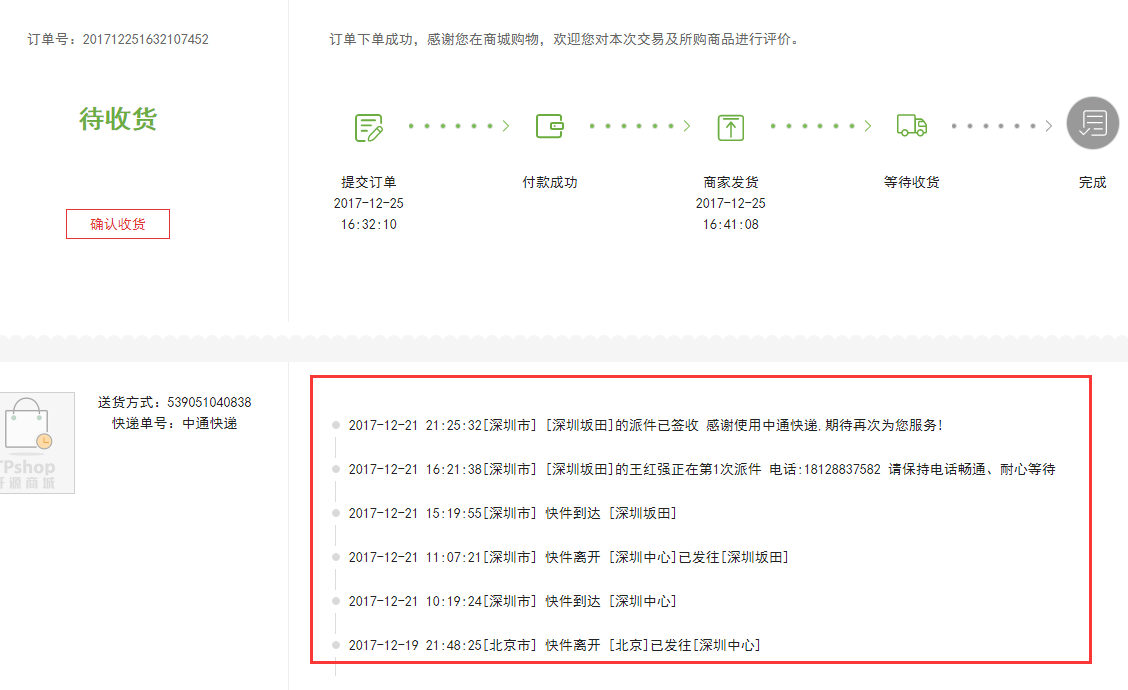订单在发货后,用户可在订单详情里查看物流信息。