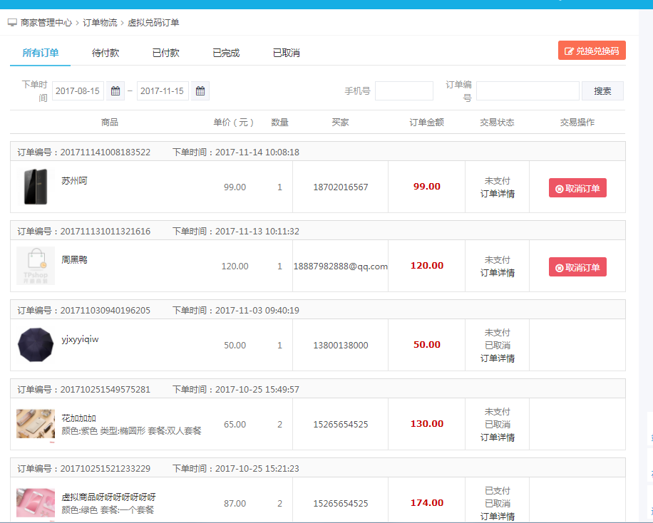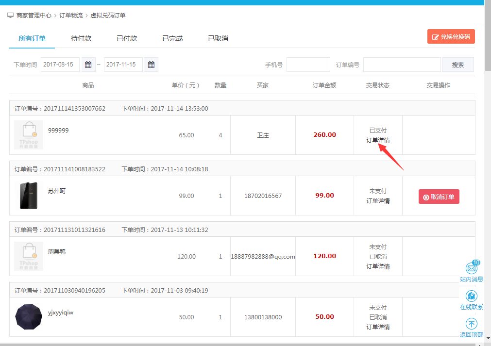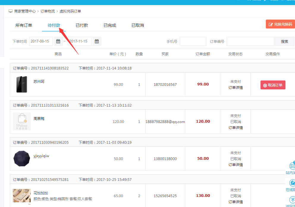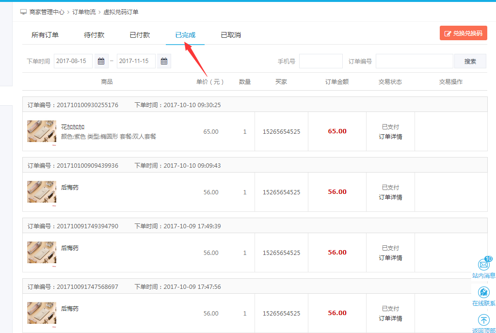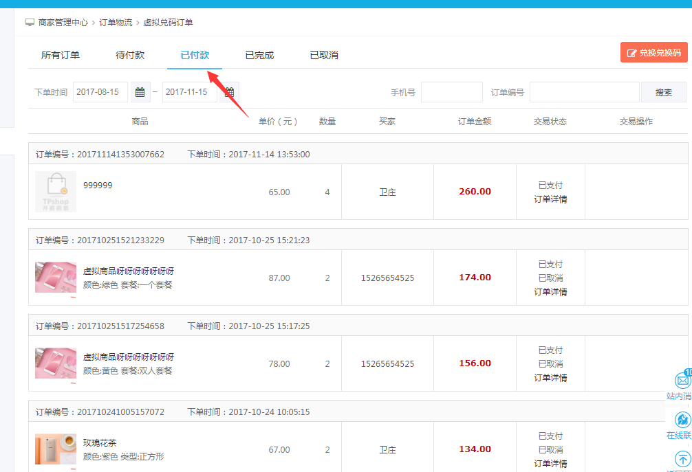在用户下单成功购买虚拟商品以后,订单就会提交到商家--虚拟订单列表。