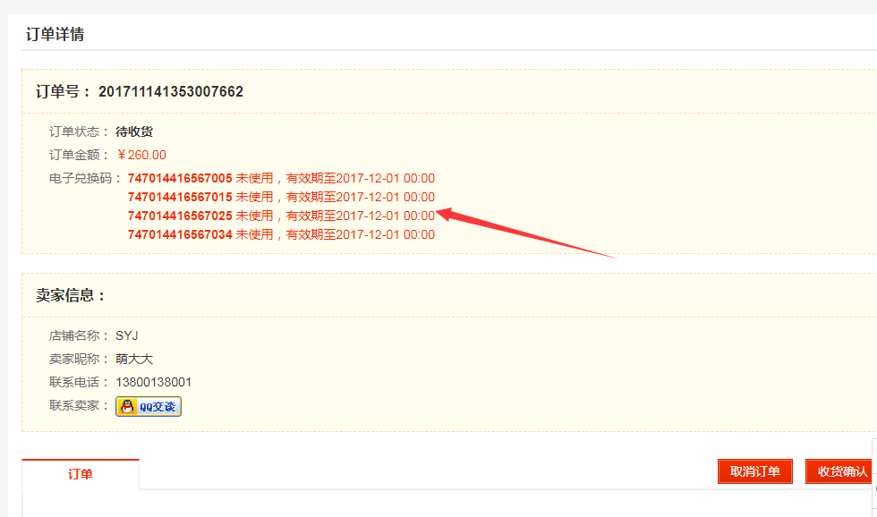 商城--商品详情兑换码展示,购买几份就会有几个兑换码。