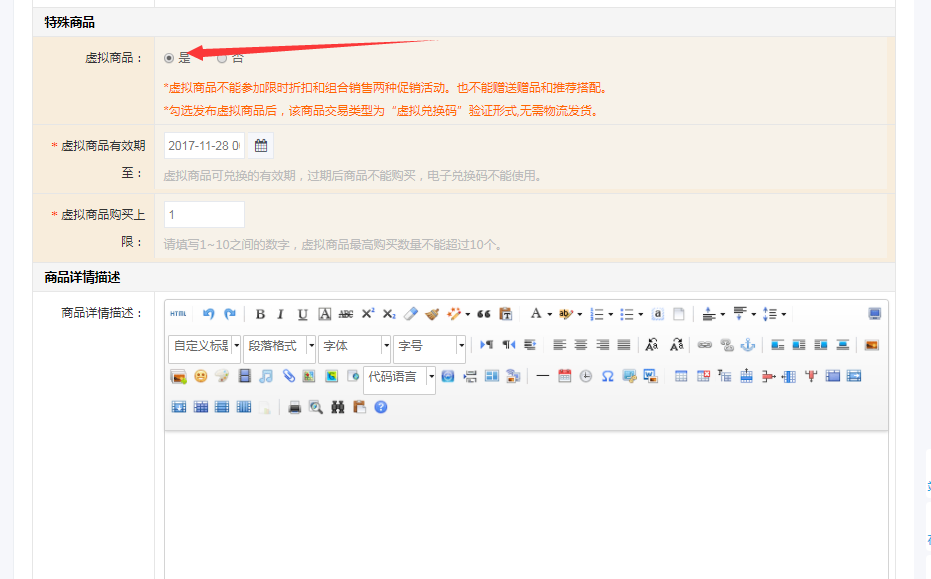 选择虚拟商品,设置虚拟商品有效期,以及虚拟商品购买上限数量。