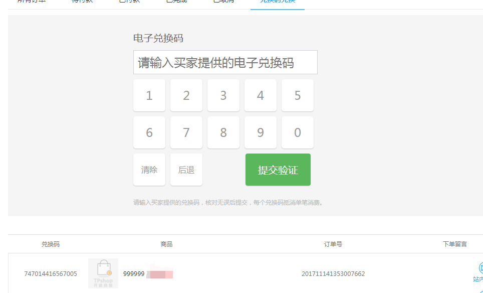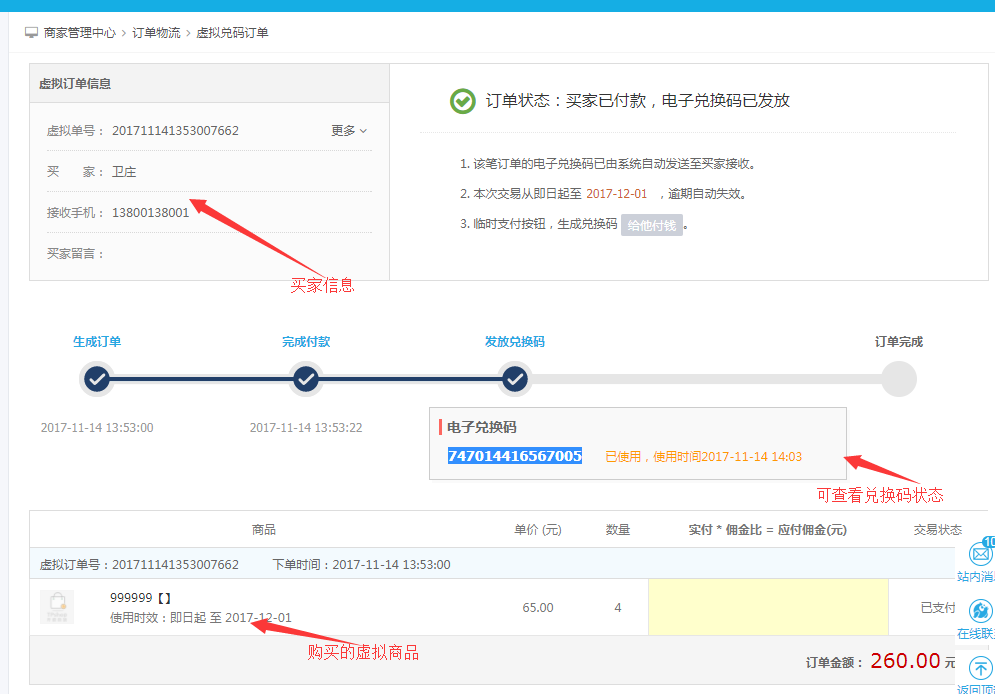 用户购买虚拟商品,下单并且支付以后,就可以获取到兑换码,系统通过发送短信告知用户或者用户自己在商品详情里获取到验证码(一定要支付成功以后,未支付是无法获取到验证码的)