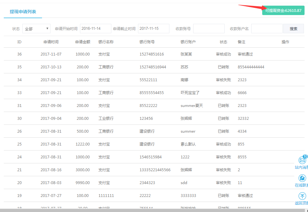 提现申请提交成功以后,可在提现申请列表查看提现申请记录状态