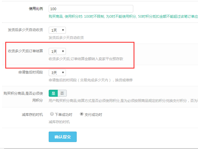 在总平台设置收货多少天后订单结算(系统--设置--商城设置--购物流程)