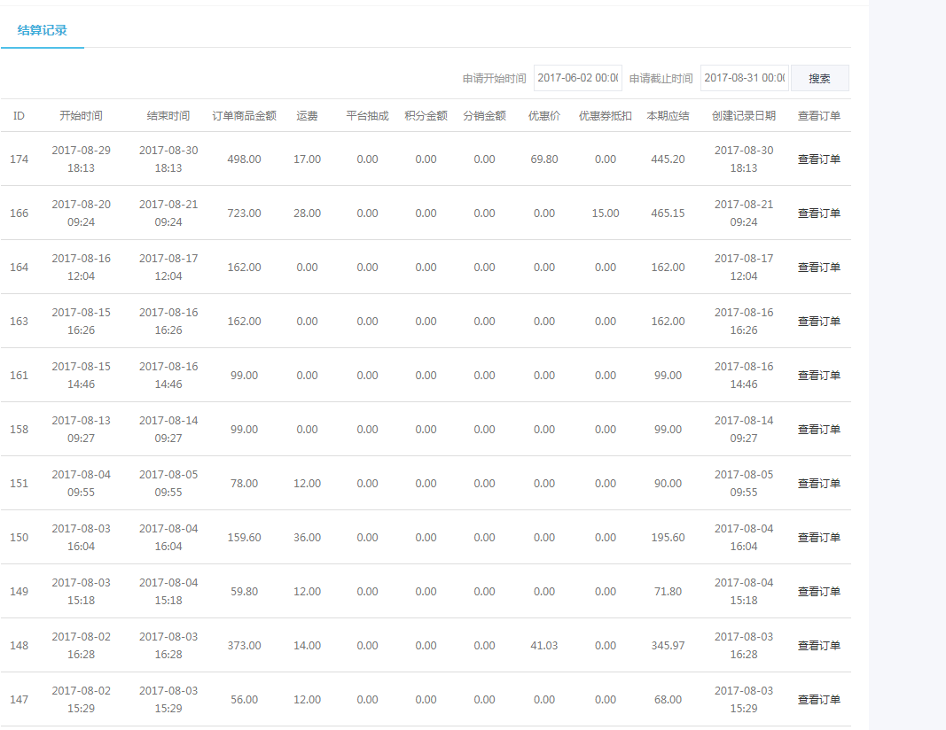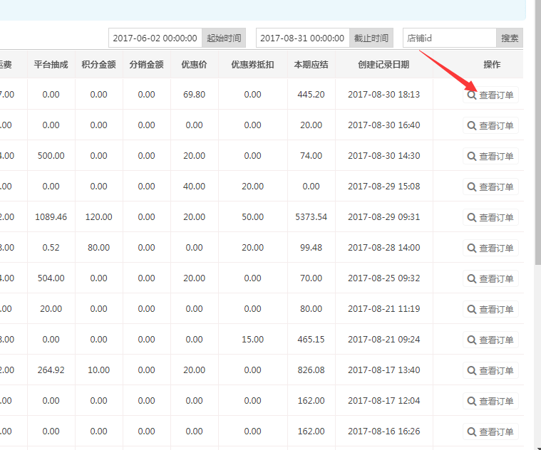 2,平台查看结算记录(全部店铺的订单结算记录)