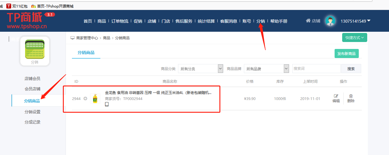 3,分销商品展示在分销商品列表(分销--分销商品)