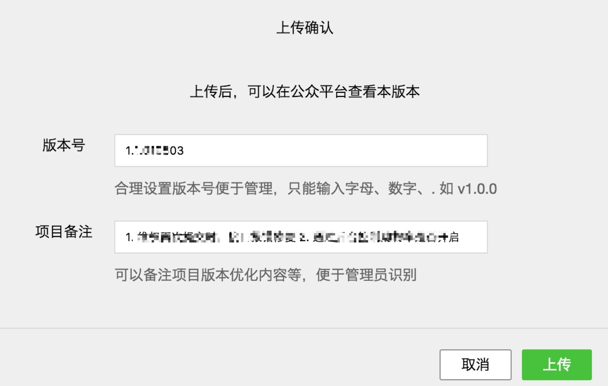 7)点击上传按钮,再次确认上传信息,填写版本号和项目备注