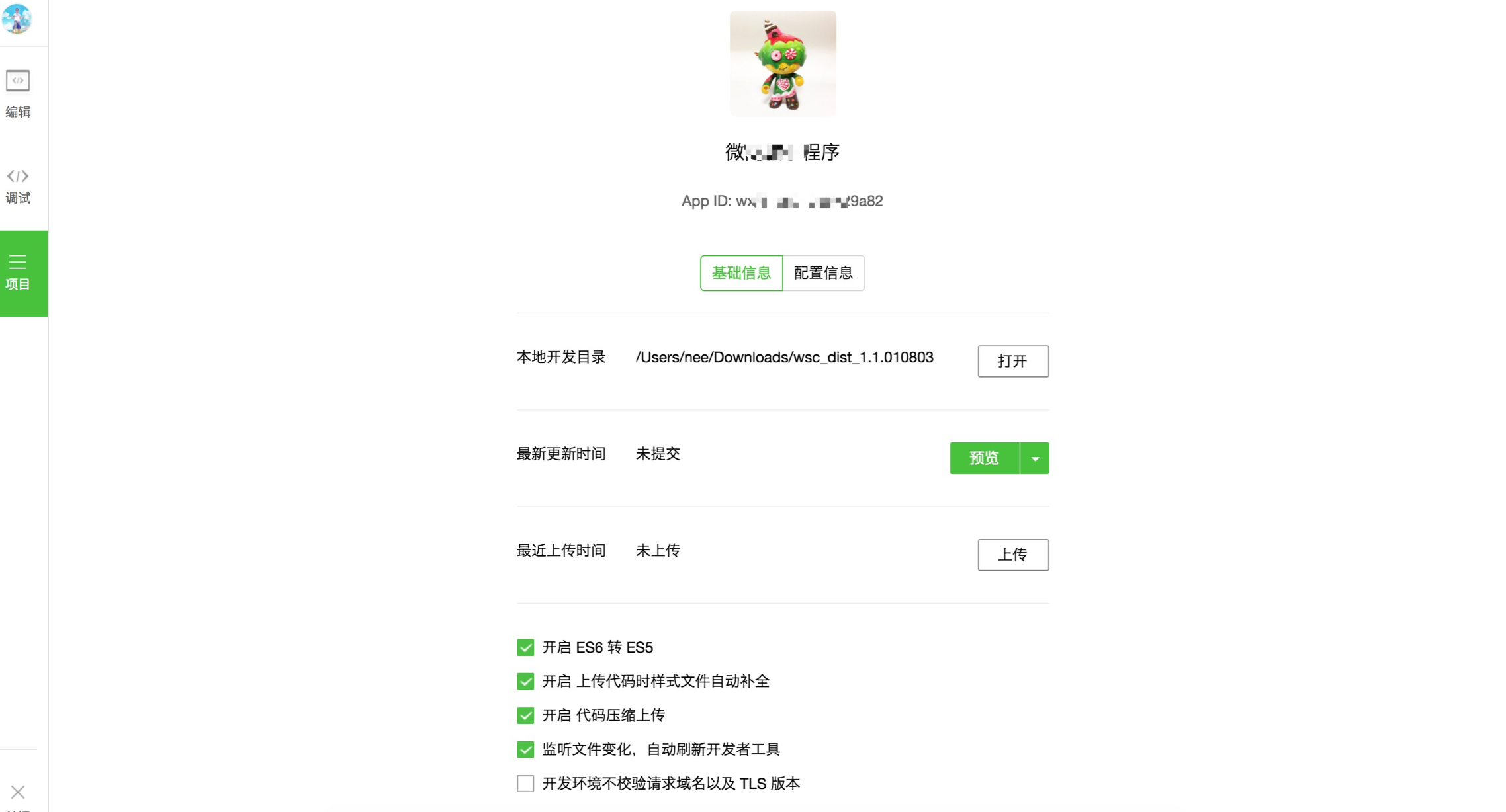 6)添加完成项目,进入项目页面,准备上传小程序。这里您需要勾选“开启ES6转ES5”、“开启上传代码时样式文件自动补全”、“开启代码压缩上传”、“开启监听文件变化,自动刷新开发者工具”,然后点击“上传”;