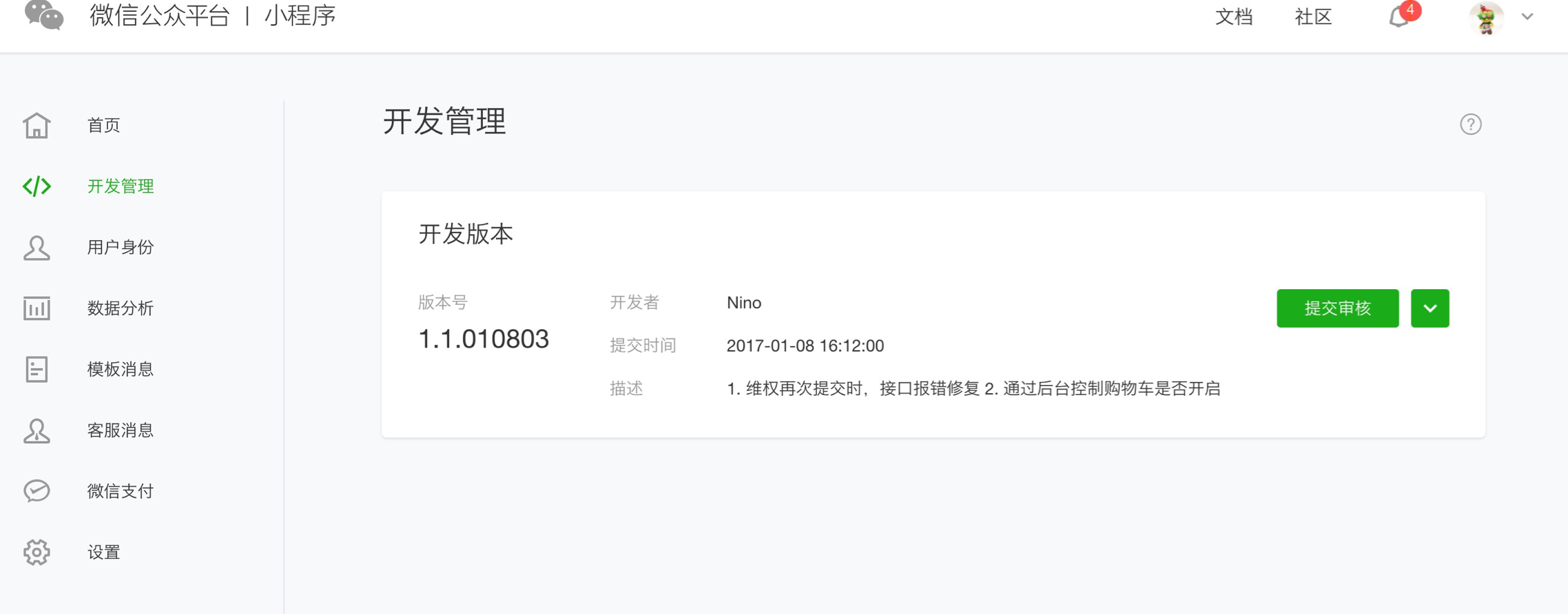 9)提交审核通过后,进入开发者管理,提交发布,小程序才会发布到线上提供服务。