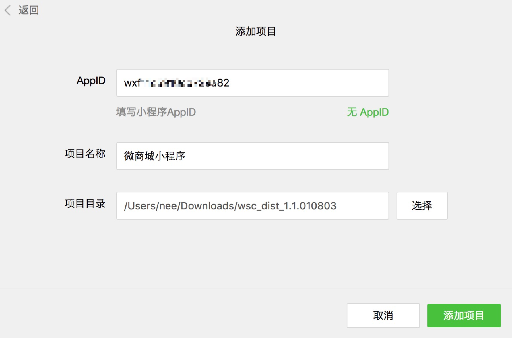 5)点击添加项目,填写AppID,填写小程序名称,选择本地的小程序包,确认无误后,点击添加项目;