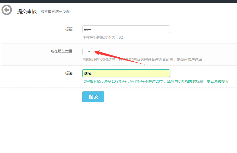 在服务类目设置完成以后。返回小程序管理后台(http://wx.tp-shop.cn/client)进入到小程序后台管理页,返回到“提交审核填写页面”。