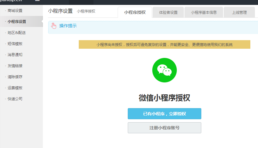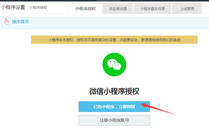 若您已经在微信公众平台注册过小程序,可直接选择“已有小程序,立即授权”
