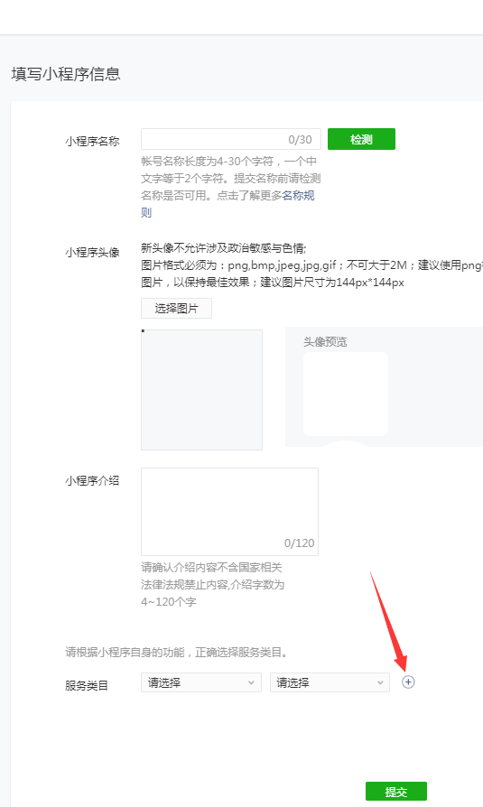 当然一个小程序也可以选择多个服务类目。只需要点击 服务类目 栏右“+”号
