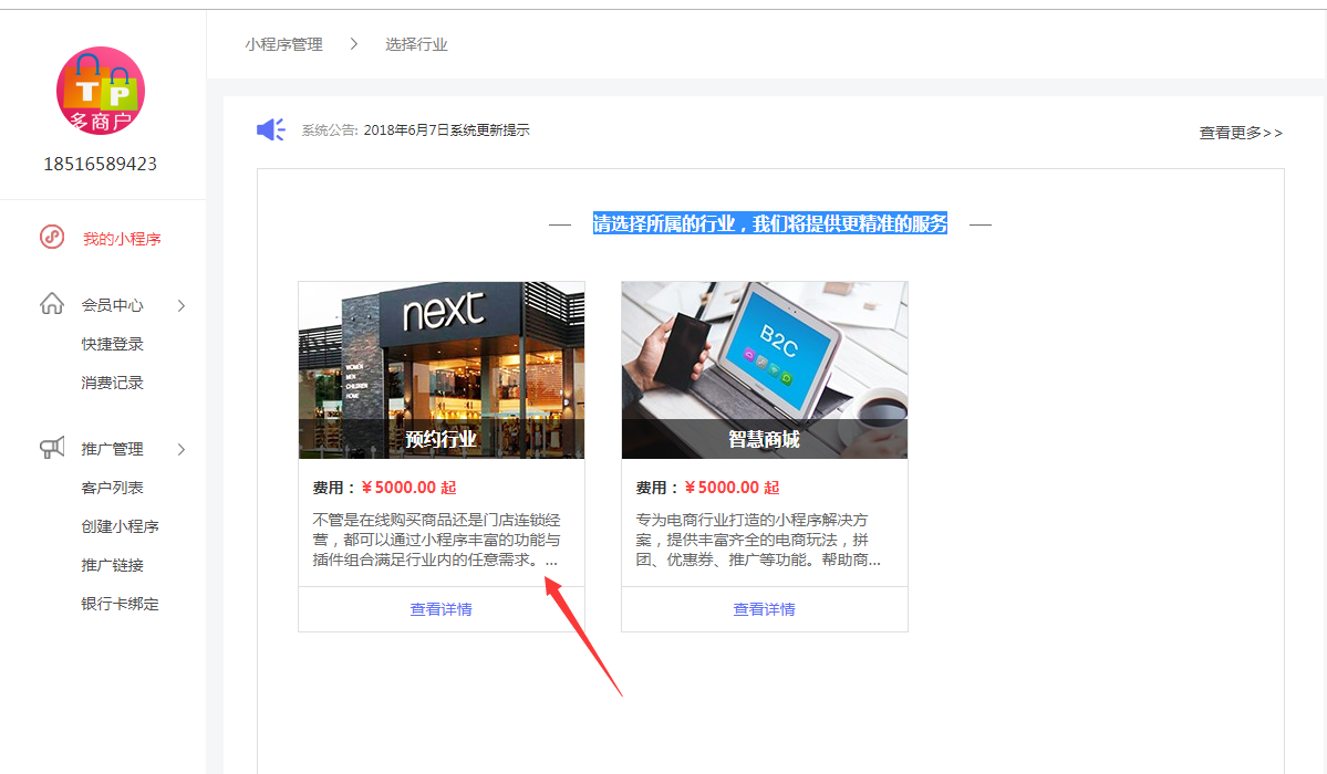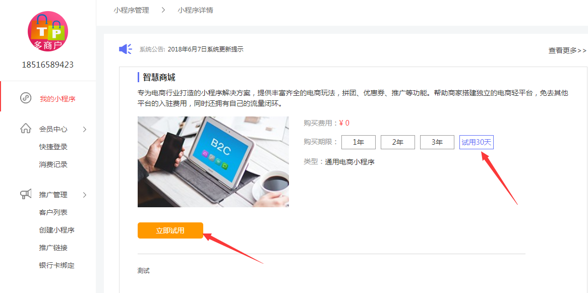 选择好行业以后,点击“查看详情”您可选择试用或者购买小程序。