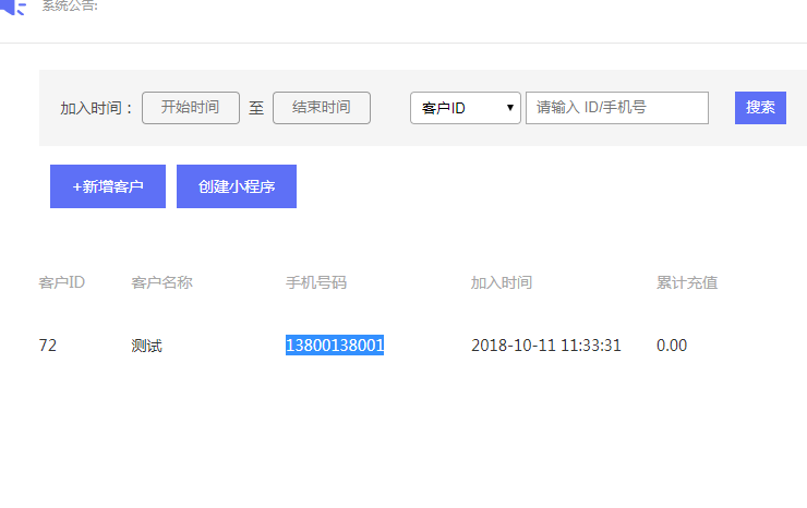点击“添加客户”跳转到客户新增页面(该客户也可以通过手机号和登录密码,在小程序管理页面登录)。