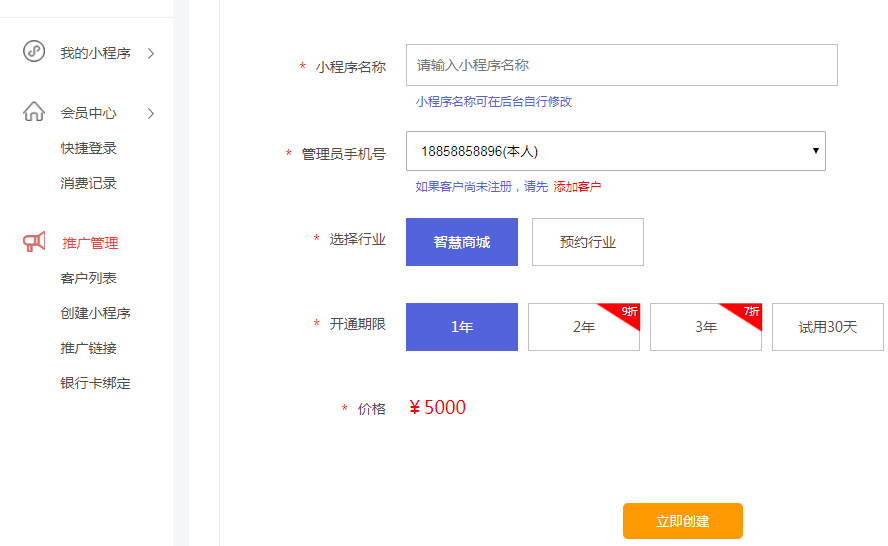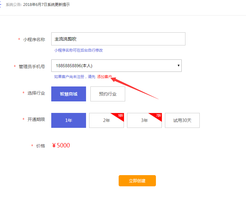 在帮客户创建小程序之前,需要先添加该客户,否则无法创建成功。