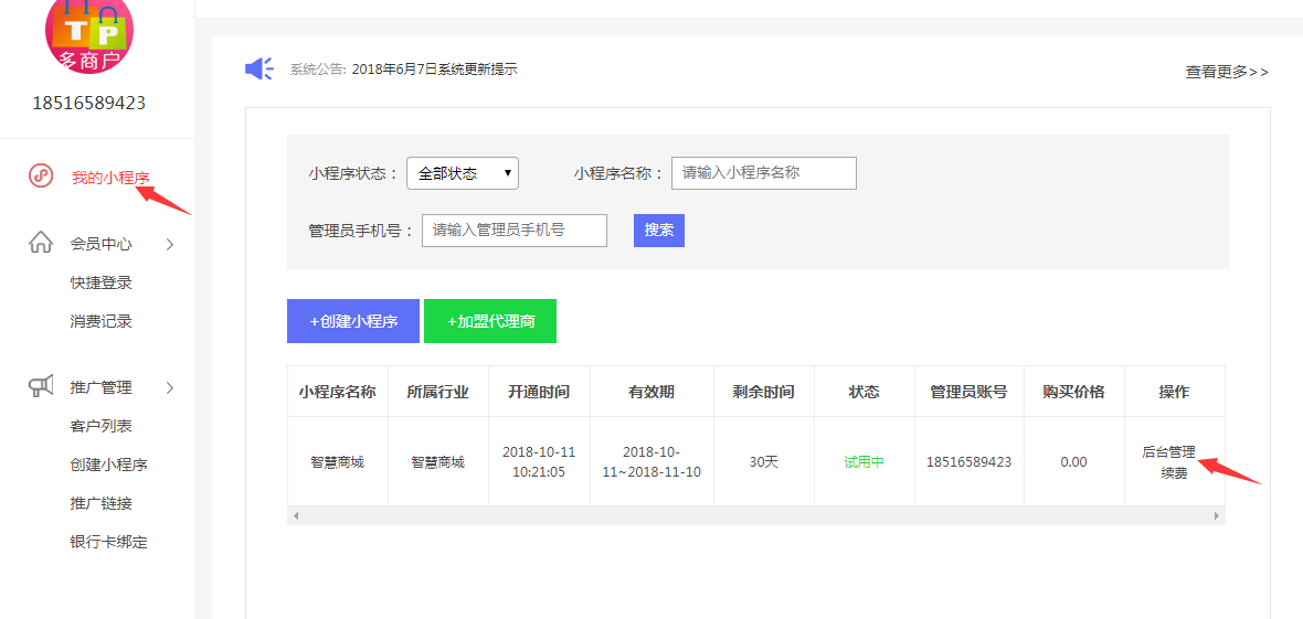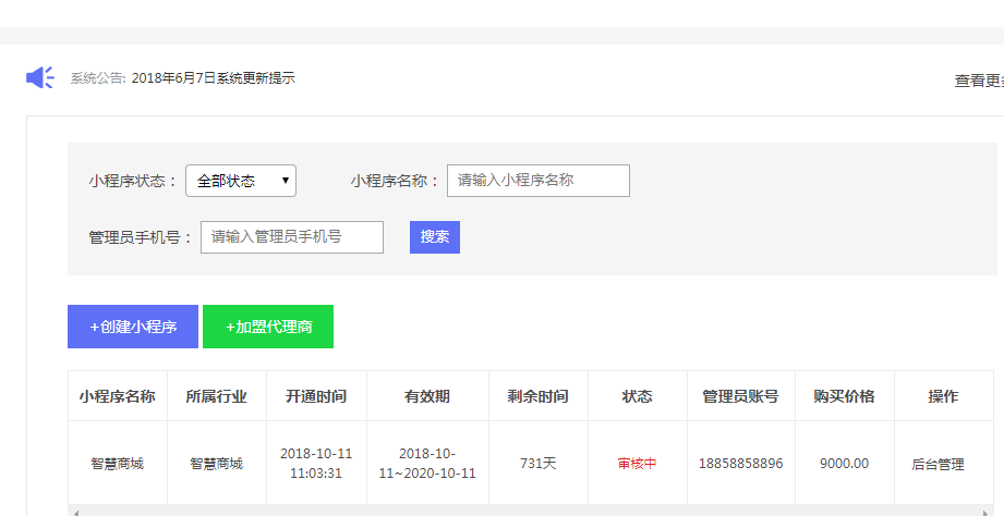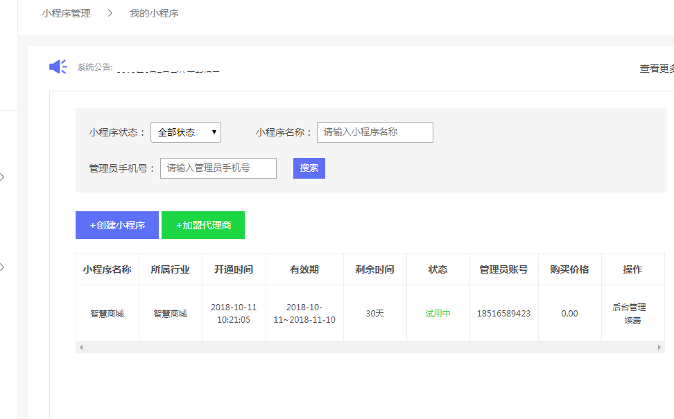 当平台审核该笔订单成功以后,用户即可通过(我的小程序--后台管理)访问我的小程序后台管理页面。