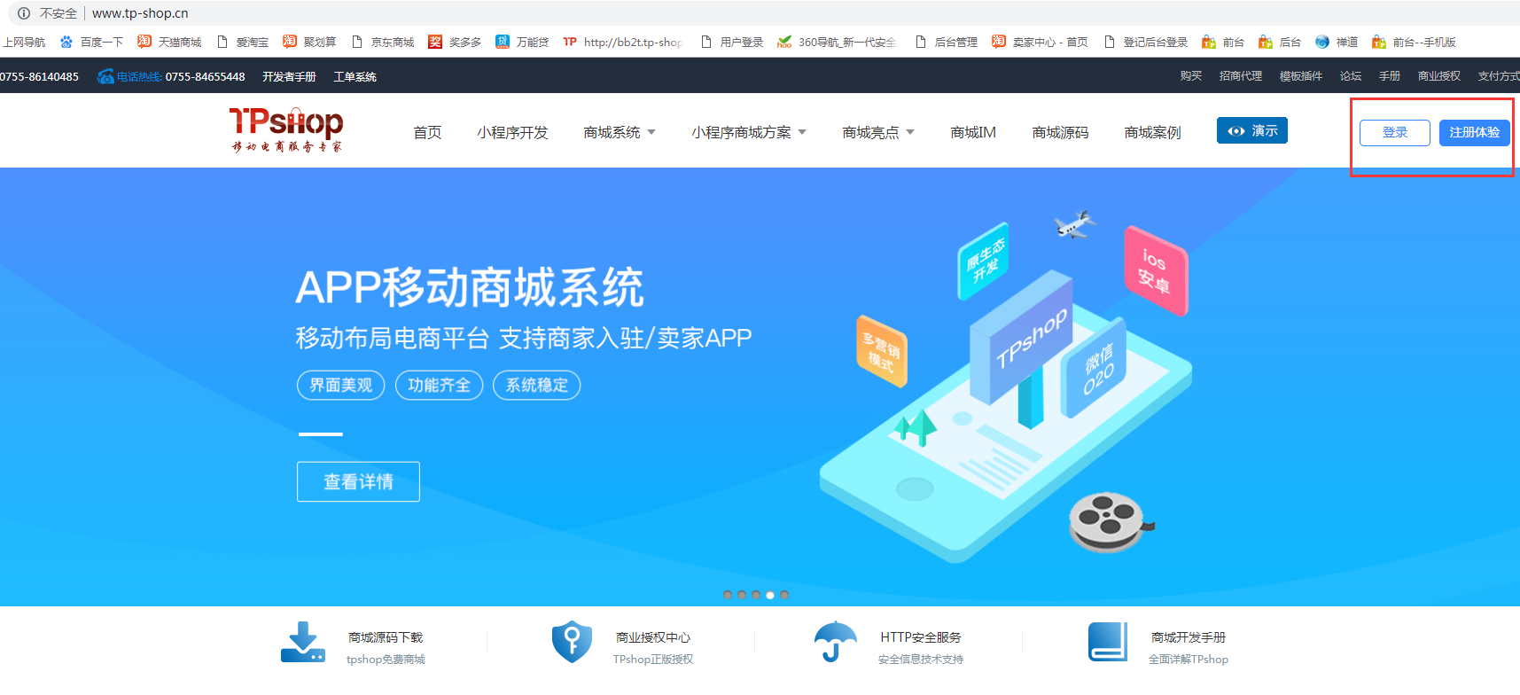 进入官网(http://www.tp-shop.cn),找到首页右边的“注册体验”“登录”按钮,点击进入小程序登录页面。