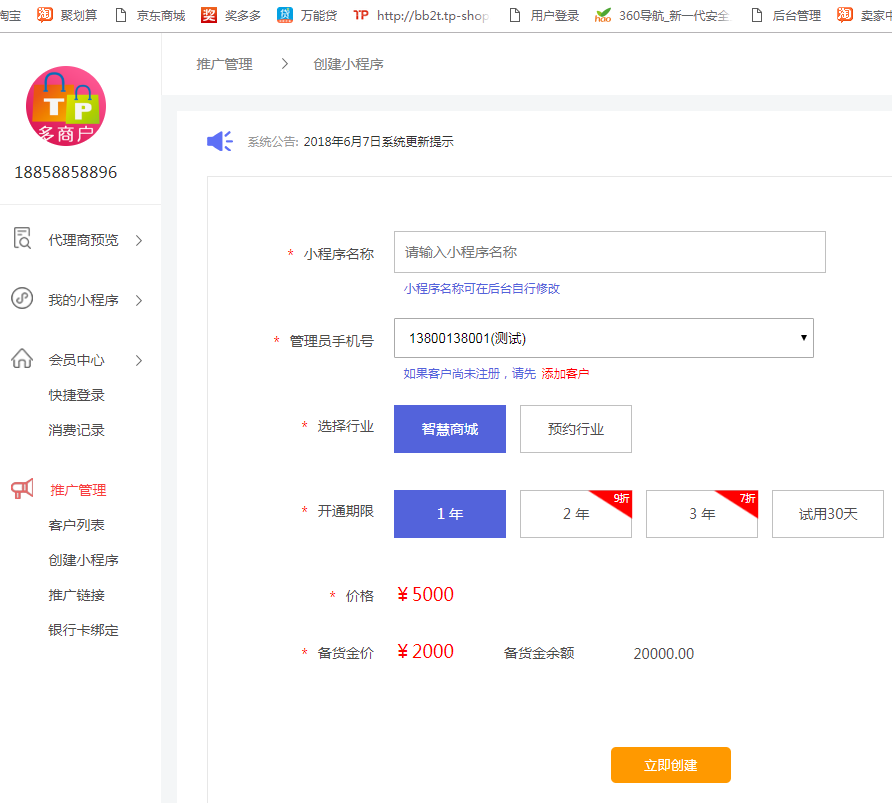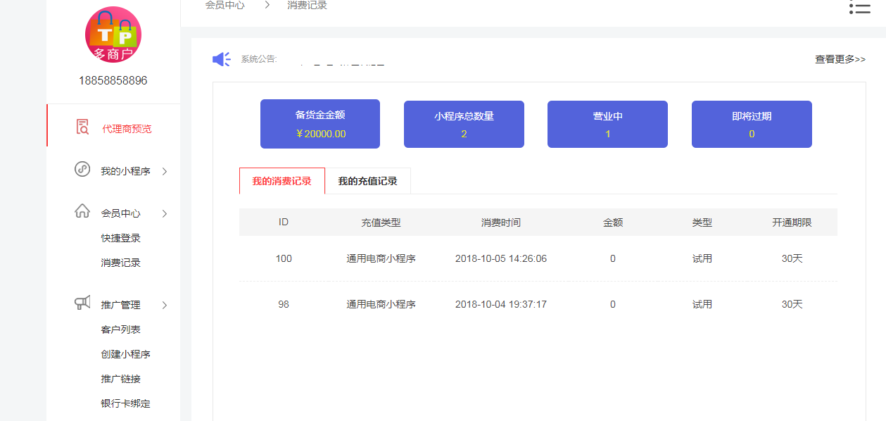 在这个页面可查看目前备货金数量,以及目前拥有的小程序量和正常使用的小程序,以及即将过期/已过期的小程序统计。