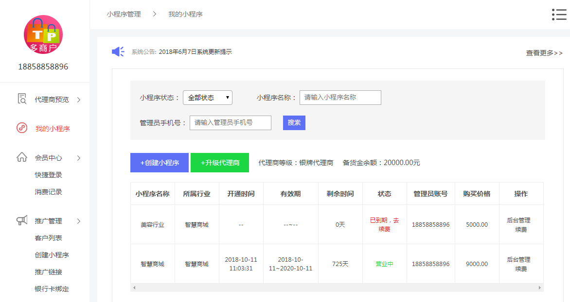 此页面可查看您目前小程序的状态,可针对已过期小程序进行续费,正常营业的小程序也可在此页面进入到“小程序后台管理”页,管理您的小程序。