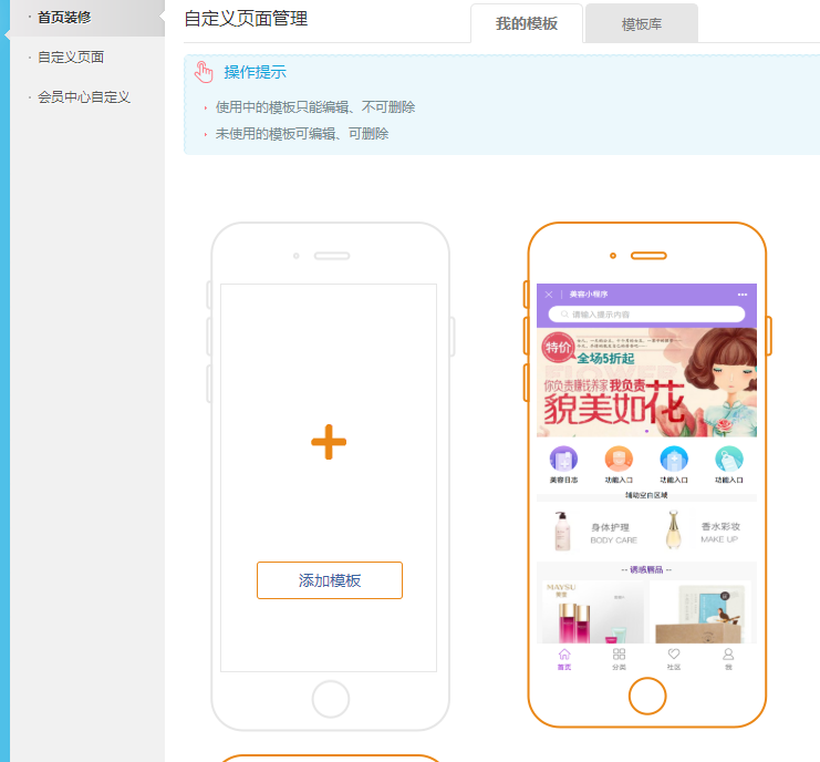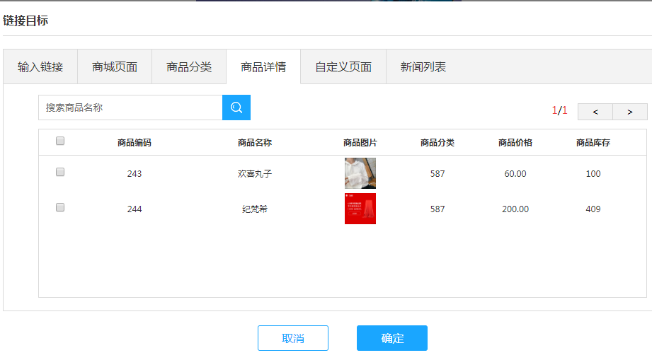 如果需要链接到某一类商品,可以选择“商品分类”链接,选择你需要链接到的商品分类,那么前台点击时,则直接跳转到此类商品列表页。(适用于海报,广告,橱窗类,组件,跳转的链接。)