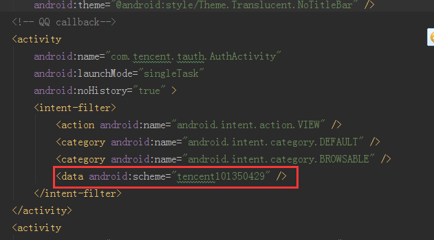 com.tencent.tauth.AuthActivity节点设置scheme="tencent+APPID", 例如: