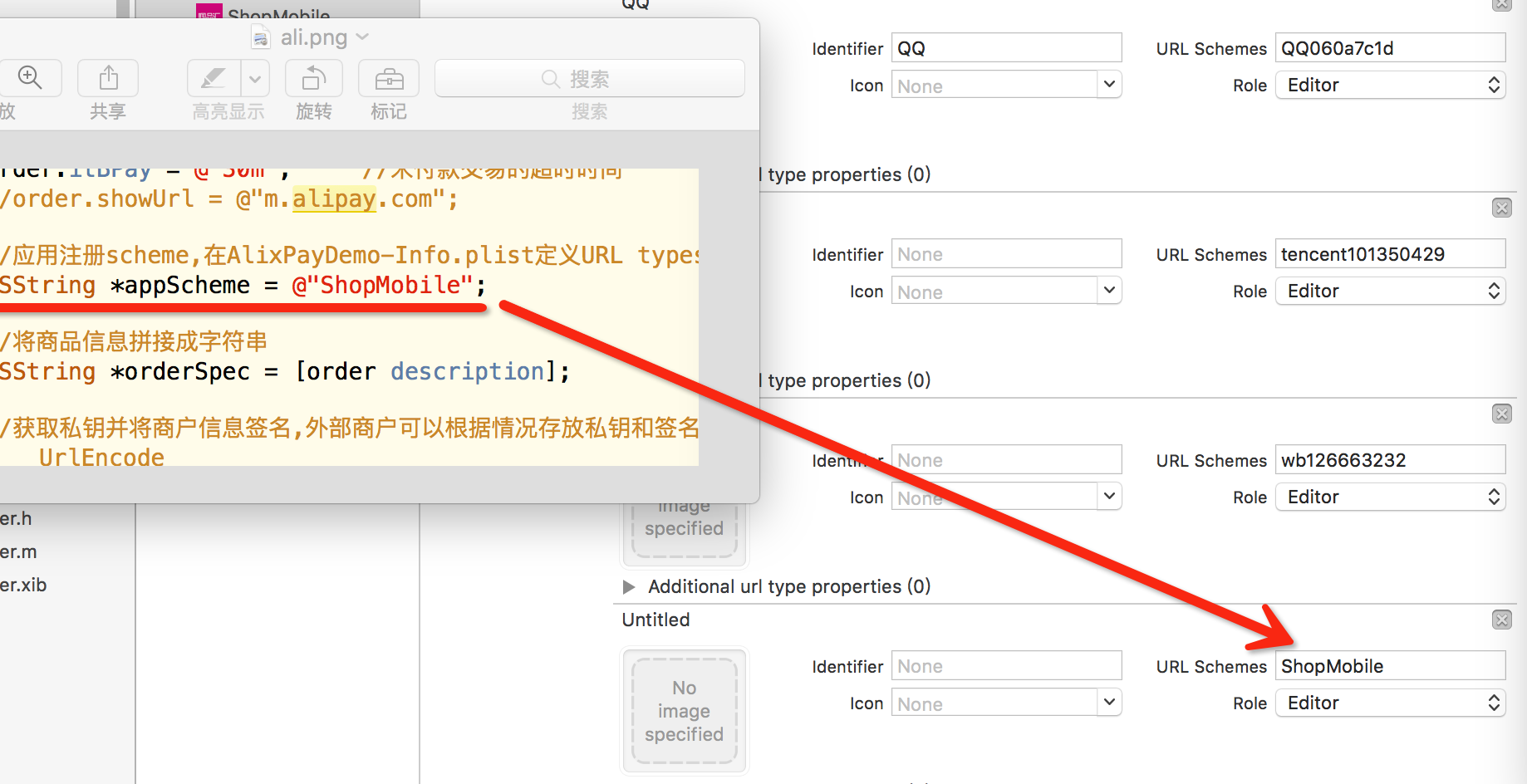 在Xcode -> target -> 项目名称 -> info 中添加URL TYPE配置, 如上图