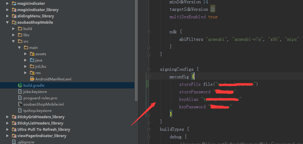 在此之前,请自己手动生成一个keystore(参考:生成keystore文档)在工程目录soubaoShopMobile -> build.lgradle 配置如下: