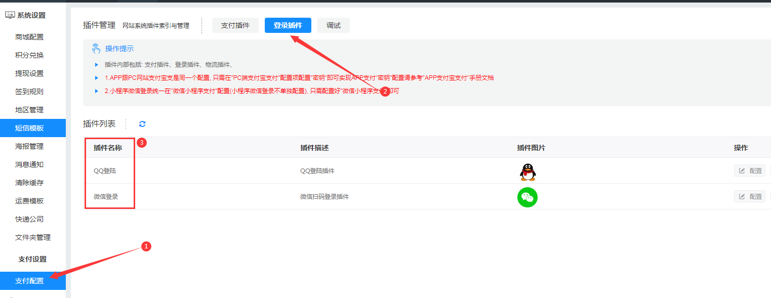 登录后台管理中心 -> 插件列表 -> 登录插件(如果没有安装,则一键安装)