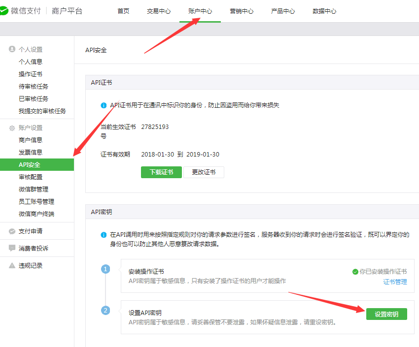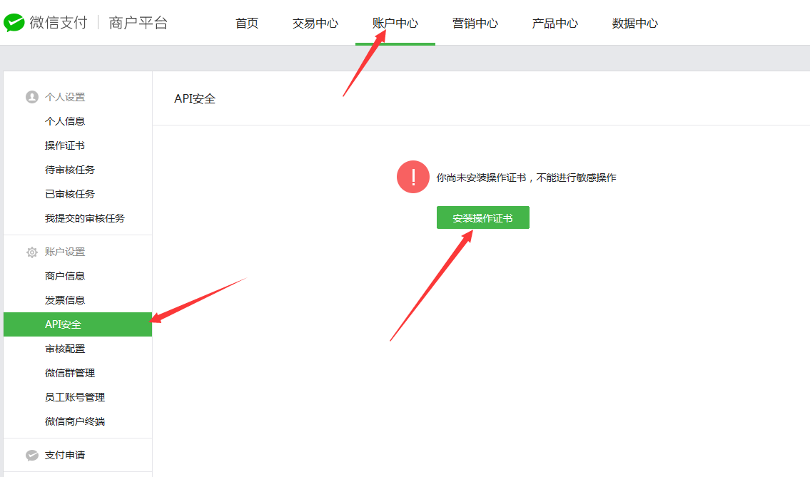 在账户中心->API安全设置证书, 首次进入会提示“安装证书”。