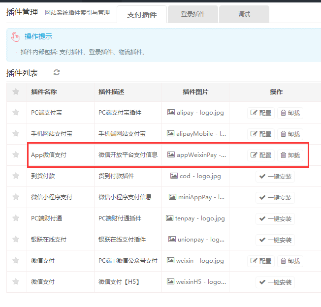 登录后台后, 在左边菜单栏中找到->插件工具->插件列表->APP微信支付