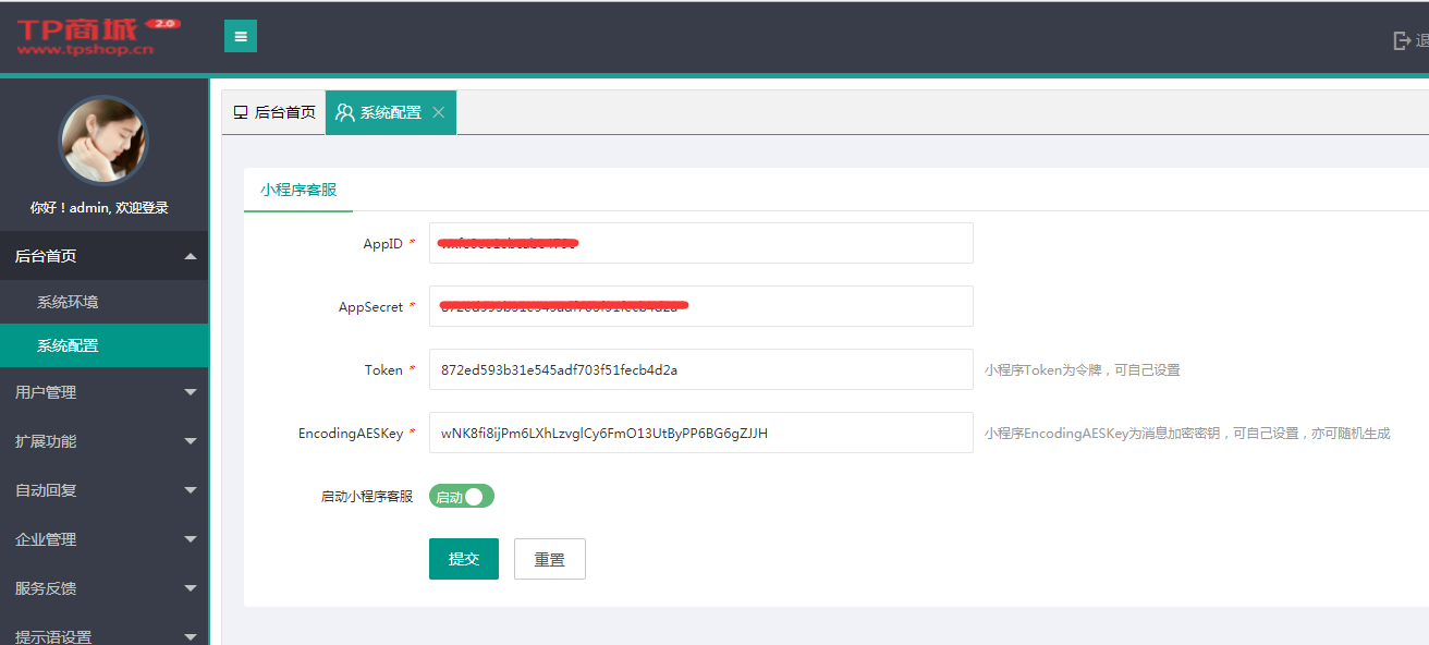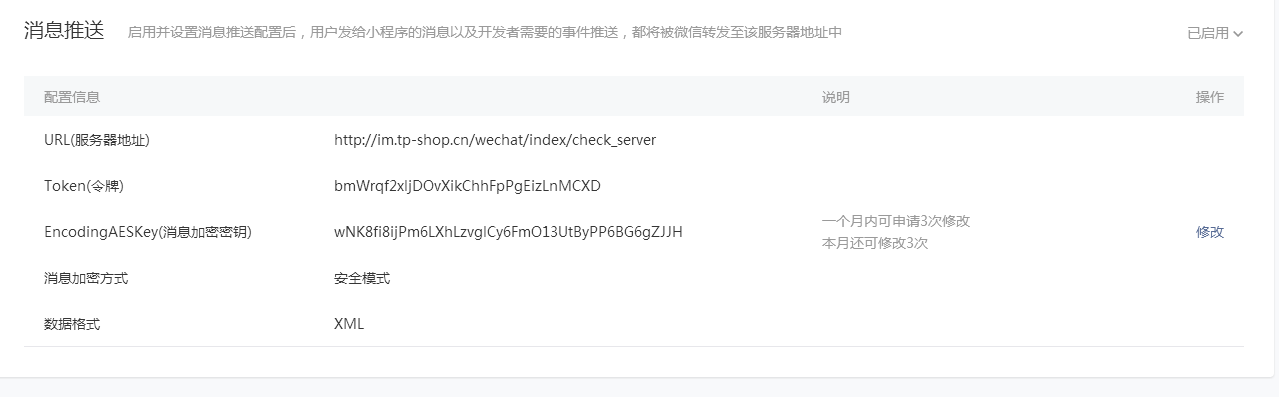 参数说明:AppID、AppSecret 为小程序的AppID、AppSecret ,Token 为小程序消息推送所设置的Token令牌,EncodingAESKey 为消息加密密钥,用于解密。(如果没有该页面,可联系TPshop IM管理员)
