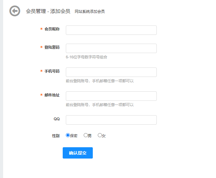 点击【添加会员】按钮后填写必要信息,最后提交即可