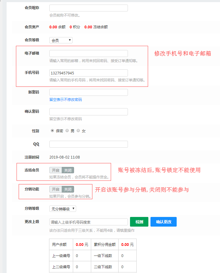 2、账号资金管理(可减少或增加余额/积分,增或减少账号冻结资金,查看资金变动记录。)