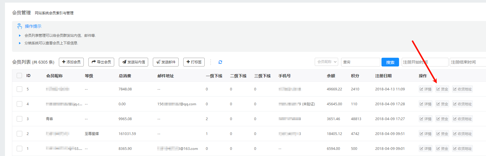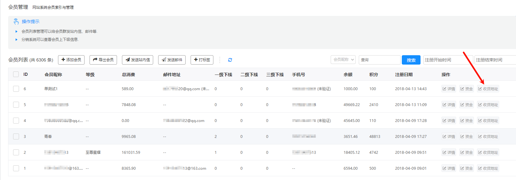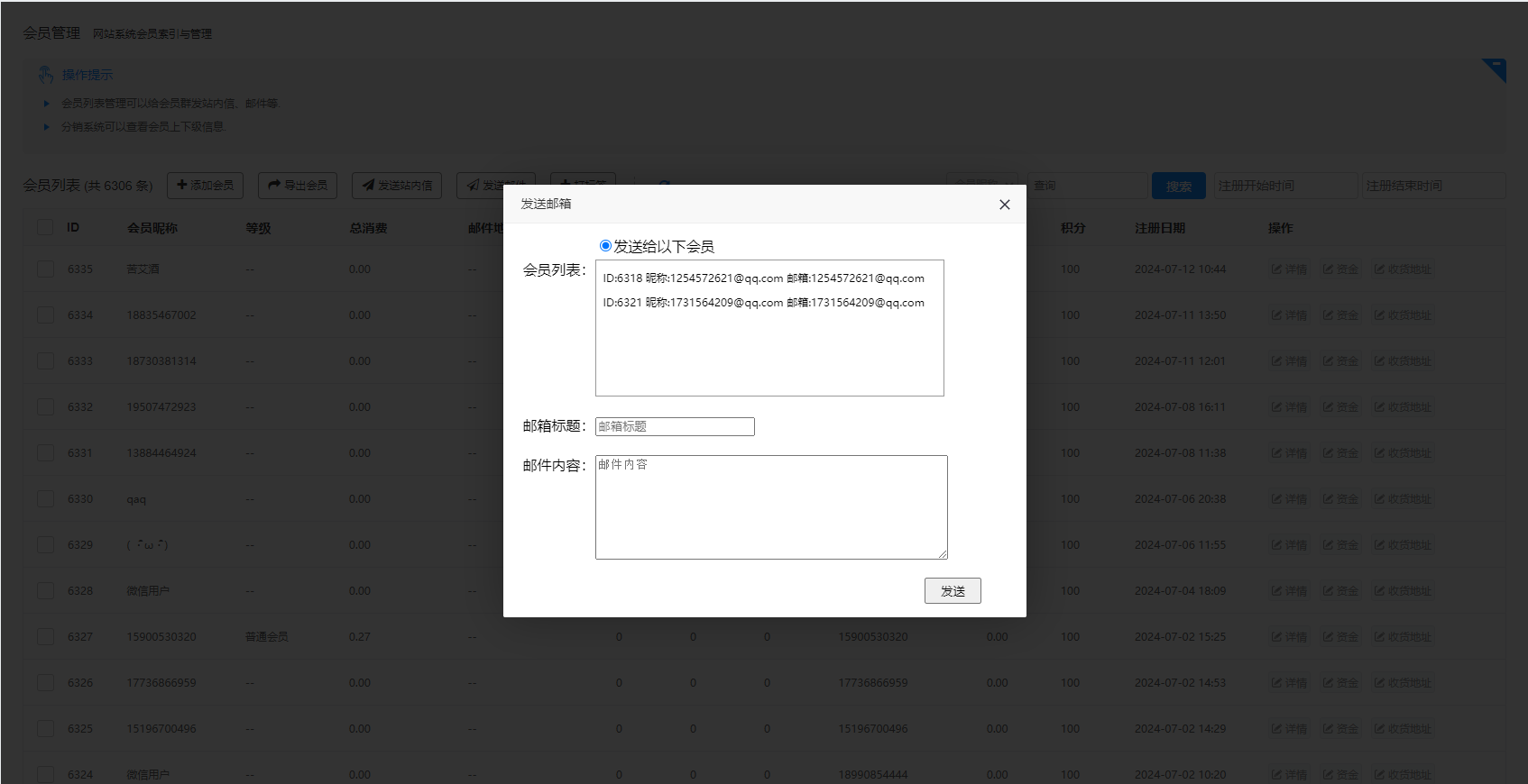 会员管理列表可添加会员,发送站内信,导出会员,发送邮件等.