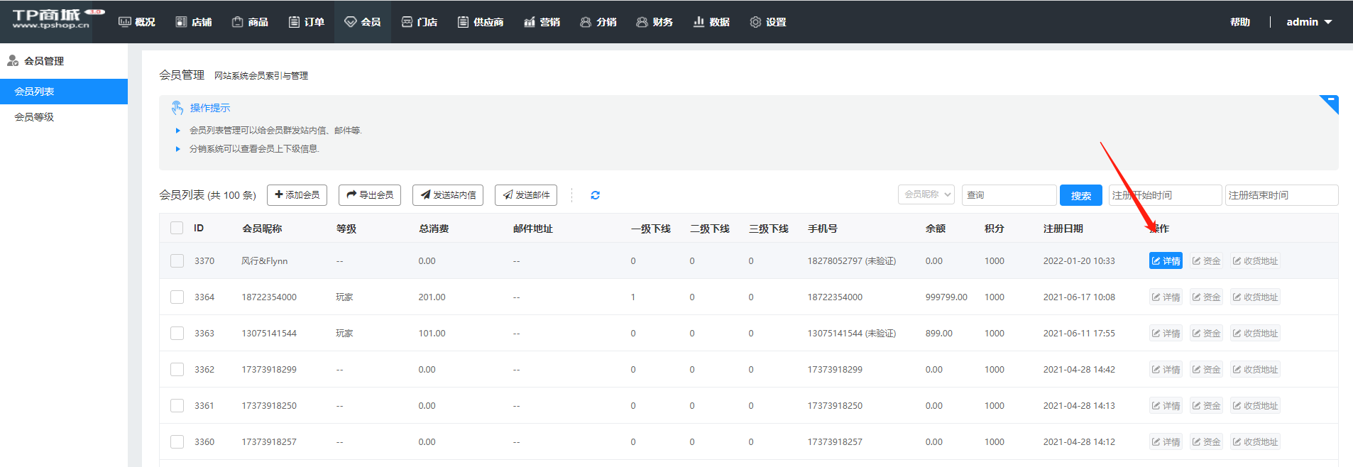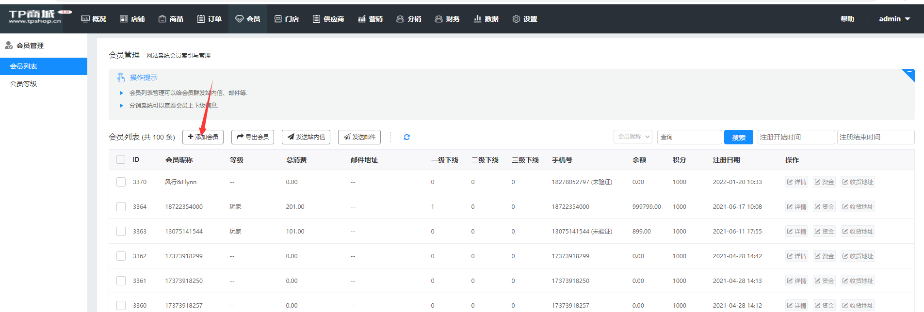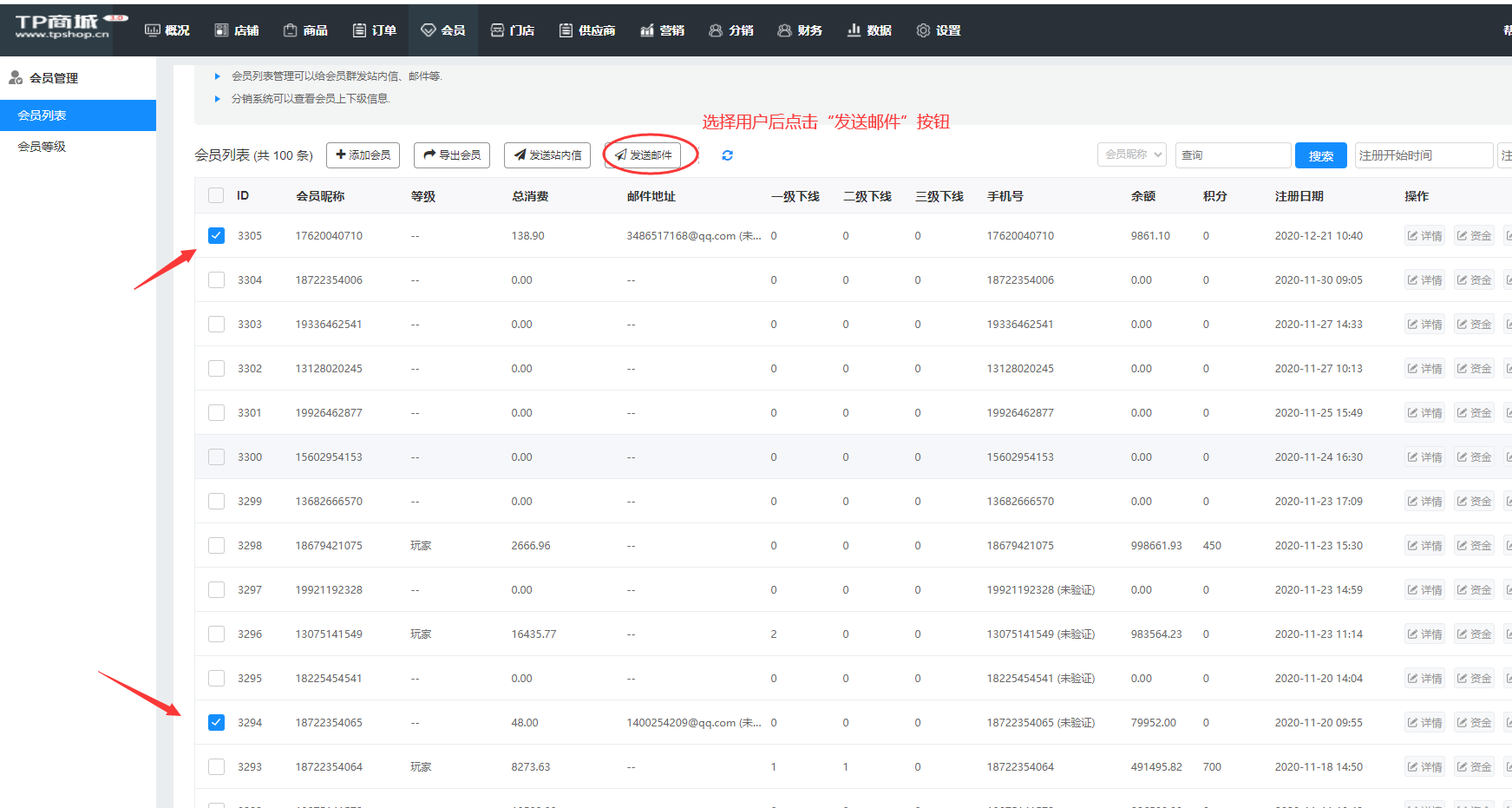 会员管理列表可添加会员,发送站内信,导出会员,发送邮件等.