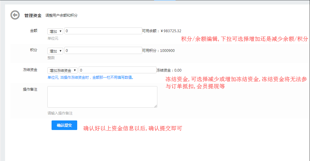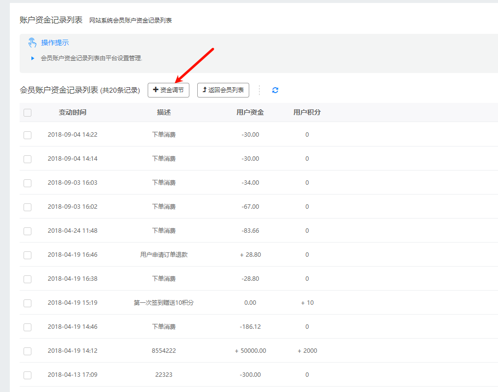 点击资金--资金调节,管理员可以给用户调节余额、积分等数据