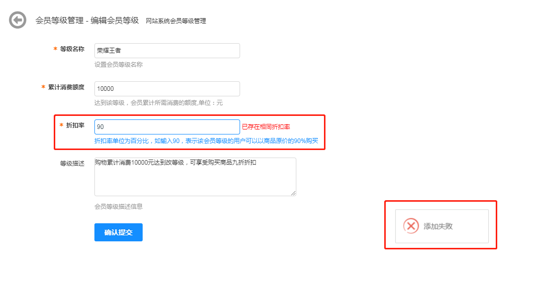 在添加会员等级的时候,出现报错提示的时候,这个时候我们需要看下已经存在的会员有我们设置重复的地方
