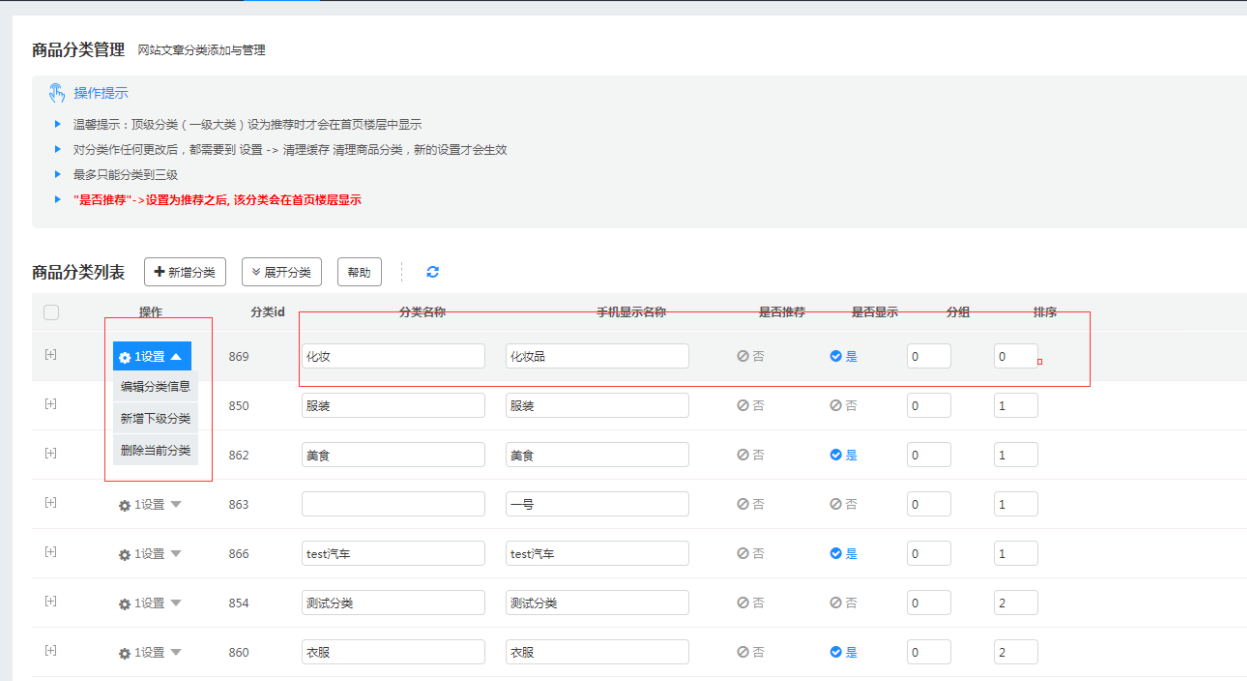 设置完成的顶级分类,这里也可以新增添加下级分类,修改分类名称和手机显示名称,选择是否推荐或者是否显示