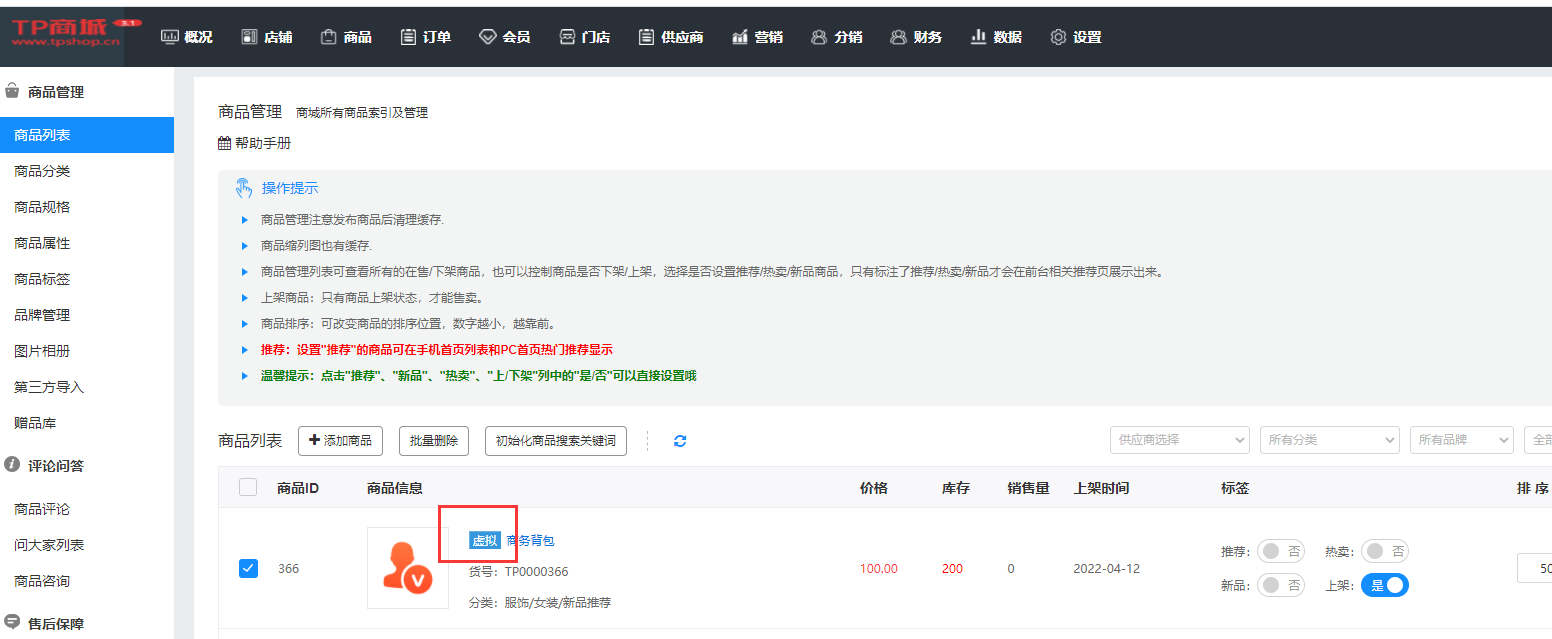 虚拟商品在商品列表里会有标注,代表是虚拟商品: