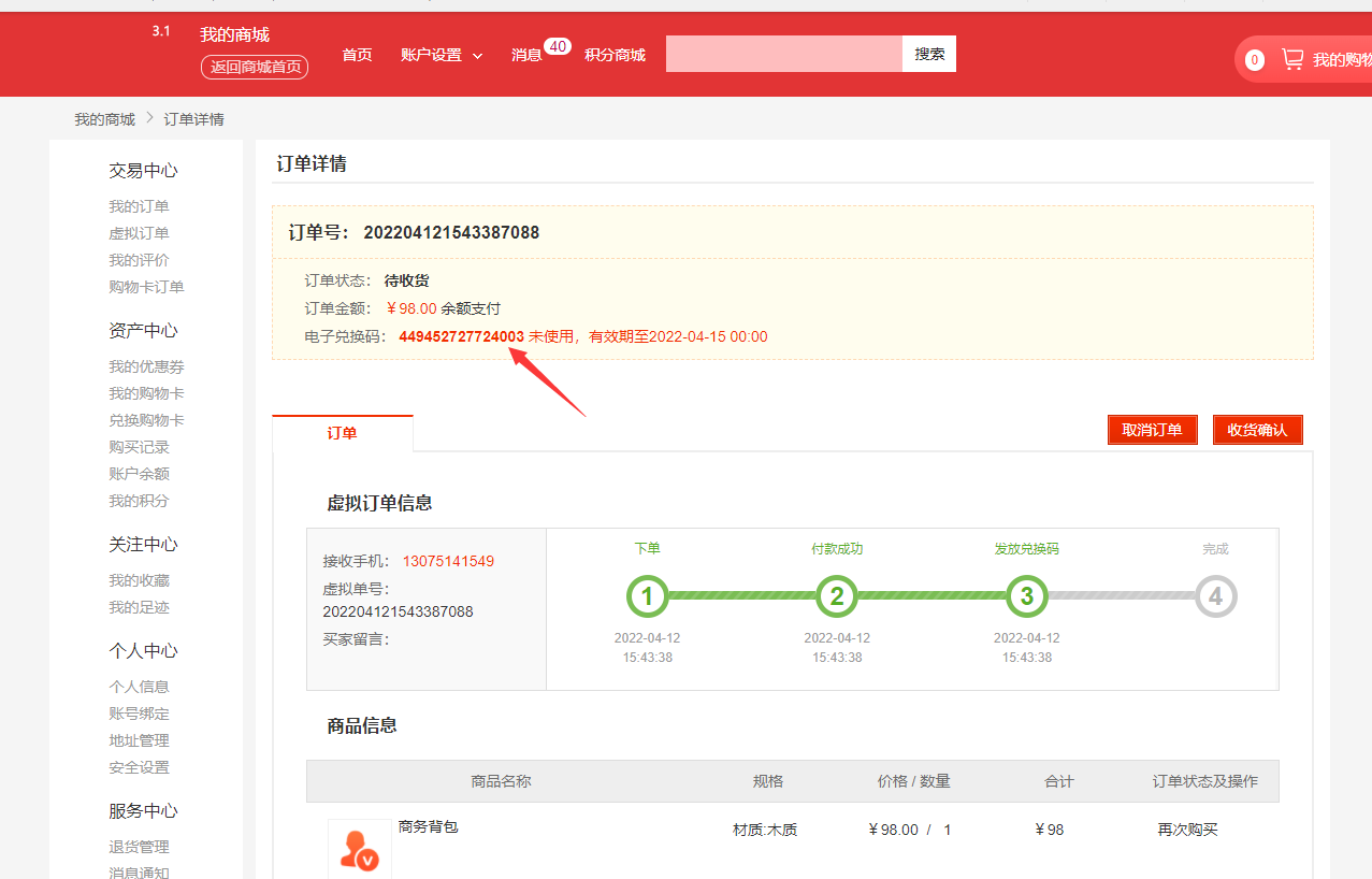 首先客户下单支付成功(这里支付成功很重要哦,因为若是只是下单成功而没有支付成功是没有办法获取到兑换码的)