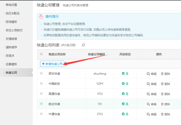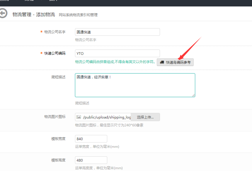 配置物流公司相关信息,其中最为重要的是快递公司编码,一定要填写快递鸟的物流编码(填错了可能会导致后面的功能无法正常使用)