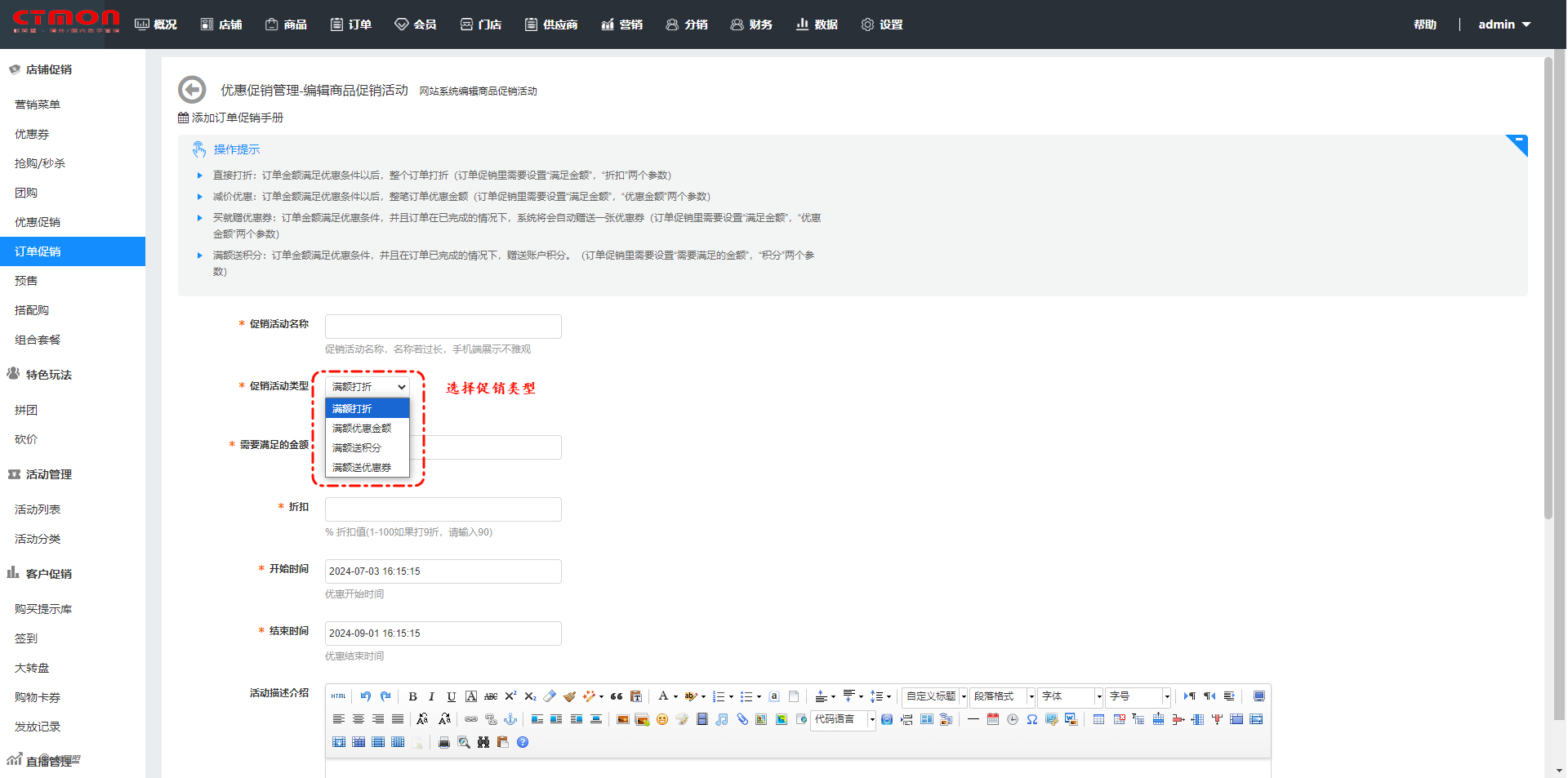 点击【添加活动】按钮,跳转到订单促销信息填写页