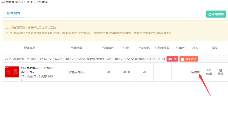 预售活动新建成功后的状态为“未审核”状态,需要等待总平台管理人员审核通过,活动才算真正的上架。