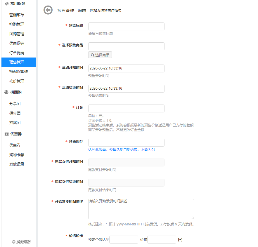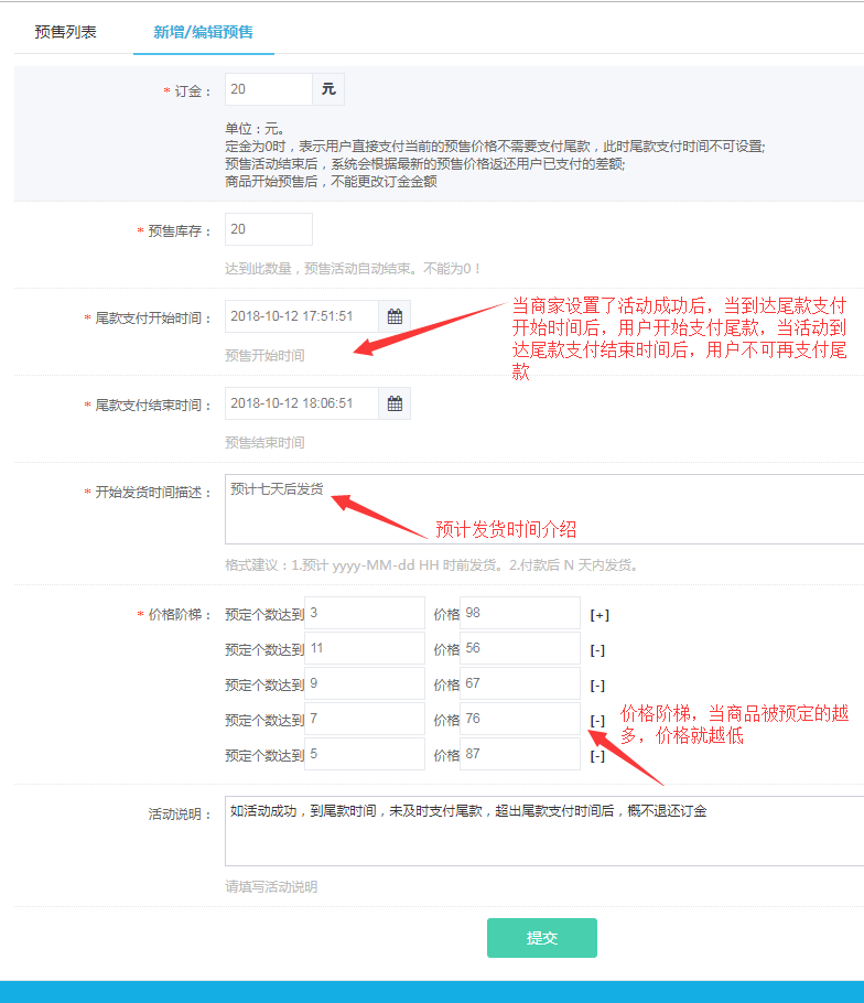 当设置好相关预售活动信息后,直接点击提交即可创建预售活动成功。