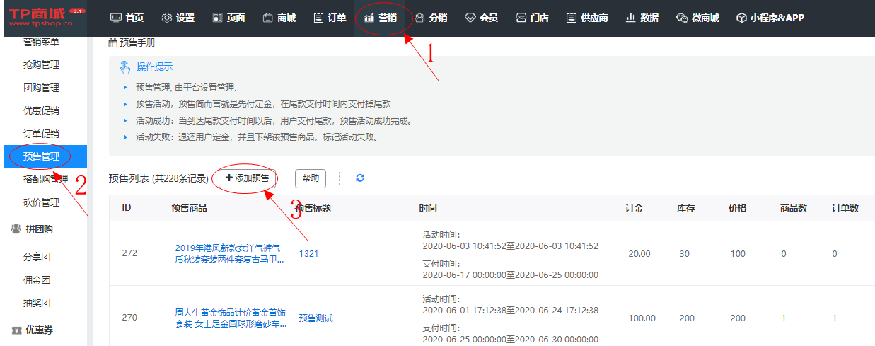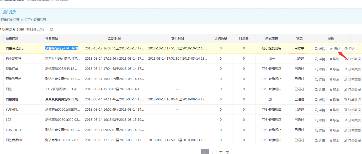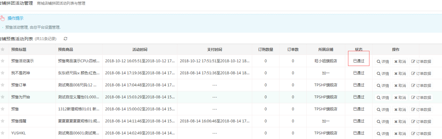 当平台通过预售活动以后,状态为“已通过”(总平台也可以取消关闭该活动)