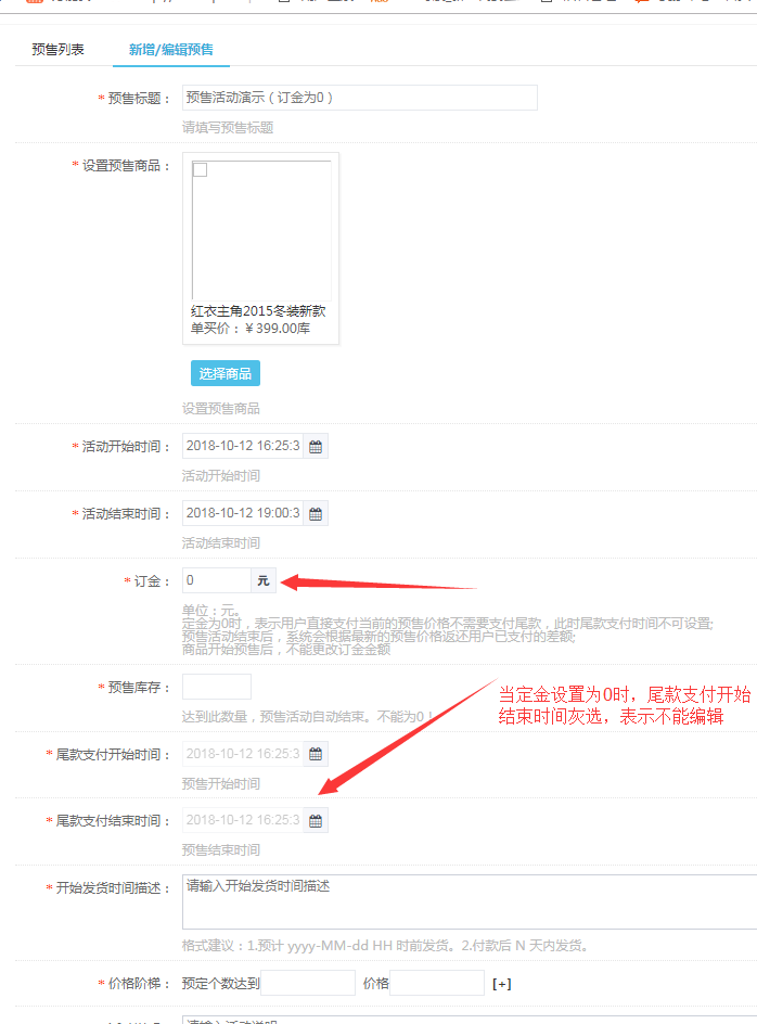 (2)订金为0时:用户不需要支付订金,可直接支付尾款,不需要设置尾款时间