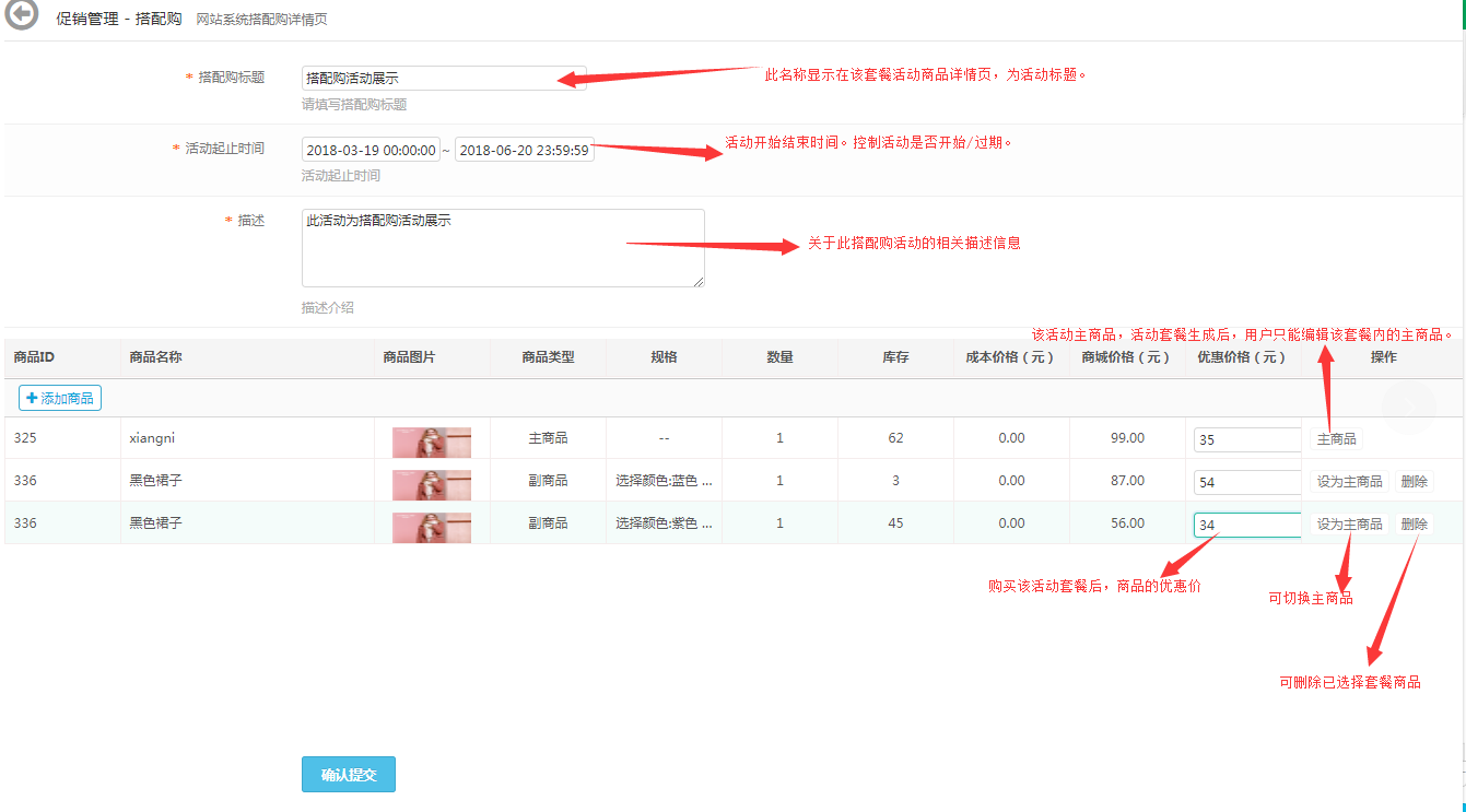搭配购套餐活动信息设置完成以后,确认提交,活动建立成功。