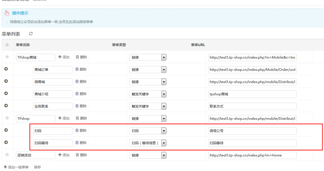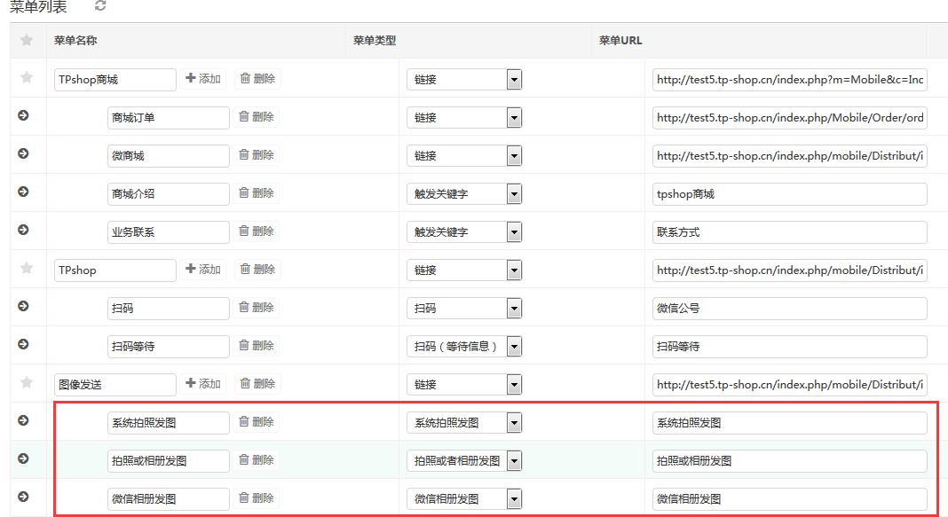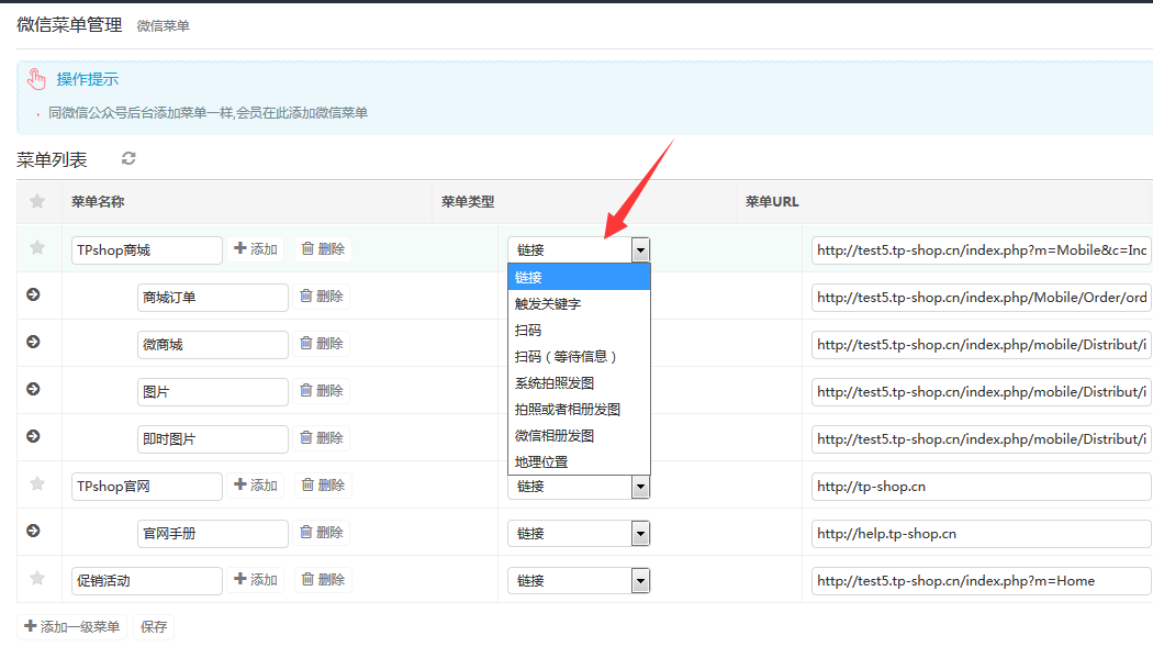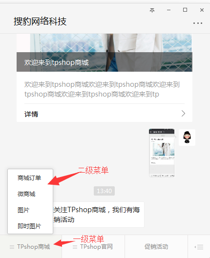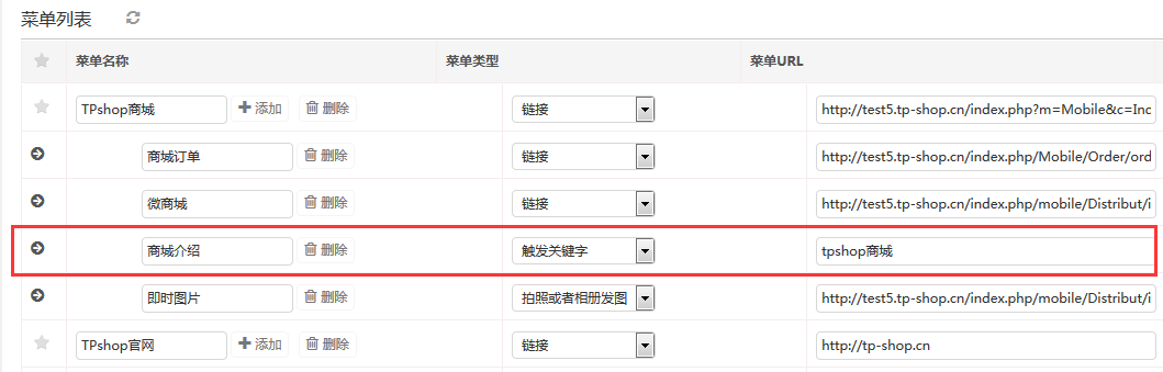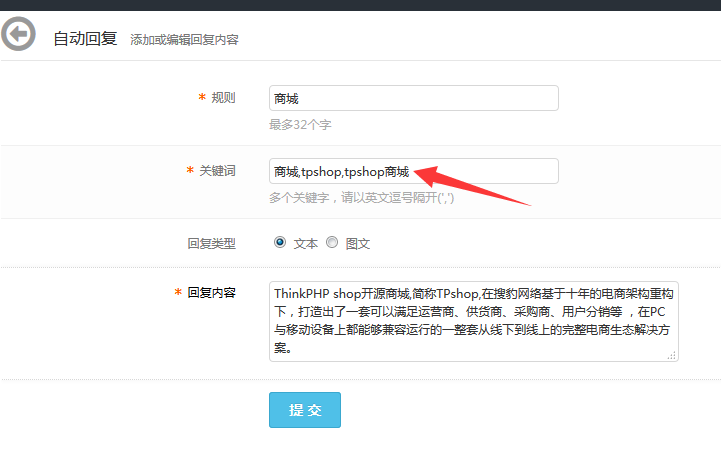 现在二级菜单“商城介绍”的菜单类型是触发关键字,设置的触发关键字是“tpshop商城”。同时这个触发关键字也是关键字自动回复里设置的关键字。