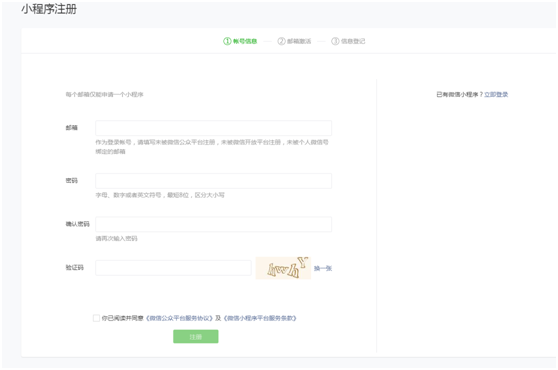 2、 进行小程序的账号信息填写,注册之后进入邮箱进行信息完善填写
